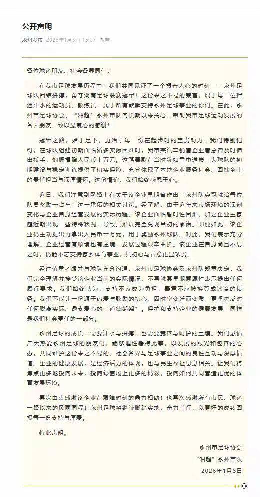 1月3日,永州市足球协会及“湘超”永州市队就近期蚁合体恤的“球队夺冠奖励愉快”一事发布公开声明体育录像/图片,示意领会撑捏企业因认识繁重难以足够终了早前愉快,并袭取其再次捐赠的十万元奖励。